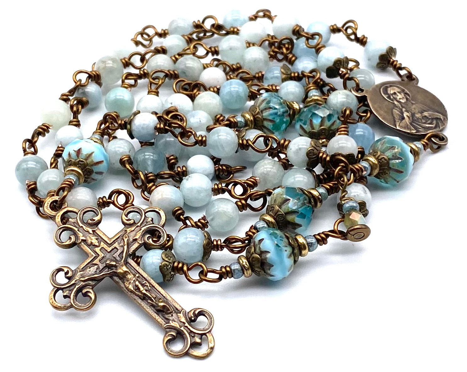 Beautiful handcrafted vintage-inspired Catholic Heirloom Rosary with Natural Aquamarine gemstones. Pater beads are Aqua Czech glass beads with Czech glass accent beads and Antique Brass bead caps. Each bead is wire wrapped using sturdy vintage bronze colored wire for strength and durability. The intricate design of the crucifix and center are antique-styled replicas giving the rosary that "Old World" finish.