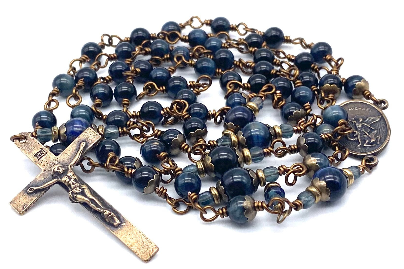 Beautiful, handcrafted vintage-inspired Catholic Heirloom Rosary with Blue Tiger Eye gemstones. Pater beads are larger Blue Tiger Eye beads with glass accent beads and Antique Brass bead caps. Each bead is wire wrapped using sturdy Vintage Bronze colored wire for strength and durability. The intricate design of the crucifix and center are antique-styled solid bronze replicas giving the Rosary that “Old World” finish.