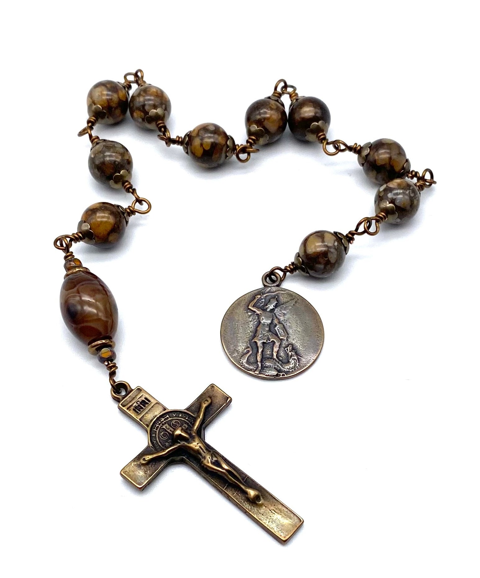 Beautiful, handcrafted vintage-inspired Catholic Heirloom 1-Decade Rosary. Each bead is wire wrapped for strength and durability. The intricate design of the centerpiece, medal and crucifix are antique-styled solid bronze replicas giving the Rosary that “Old World” finish.