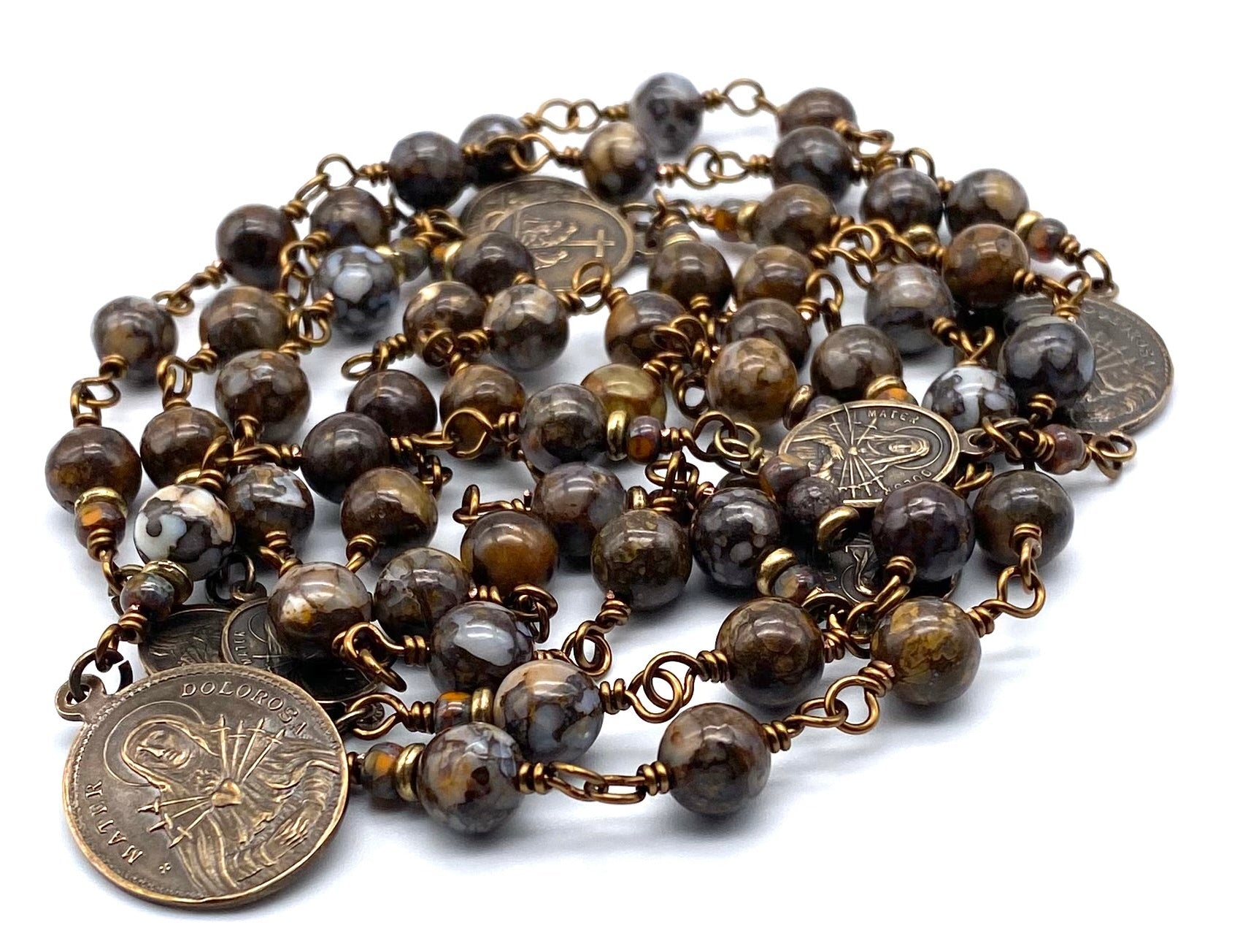 Beautiful, handcrafted vintage-inspired Catholic Heirloom Rosary of the Seven Sorrows. Each bead is wire wrapped for strength and durability. The intricate design of the medals and center are antique-styled solid bronze replicas giving the Rosary that “Old World” finish.
