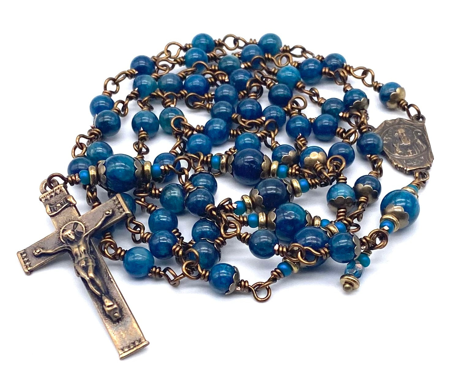 Beautiful, handcrafted vintage-inspired Catholic Heirloom Rosary with Dark Blue Apatite gemstone. Pater beads are Dark Blue Apatite gemstones with Deep Blue Czech glass beads and Antique Brass bead caps. Each bead is wire wrapped using sturdy Vintage Bronze colored wire for strength and durability. The intricate design of the crucifix and center are antique-styled bronze replicas giving the Rosary that "Old World" finish.