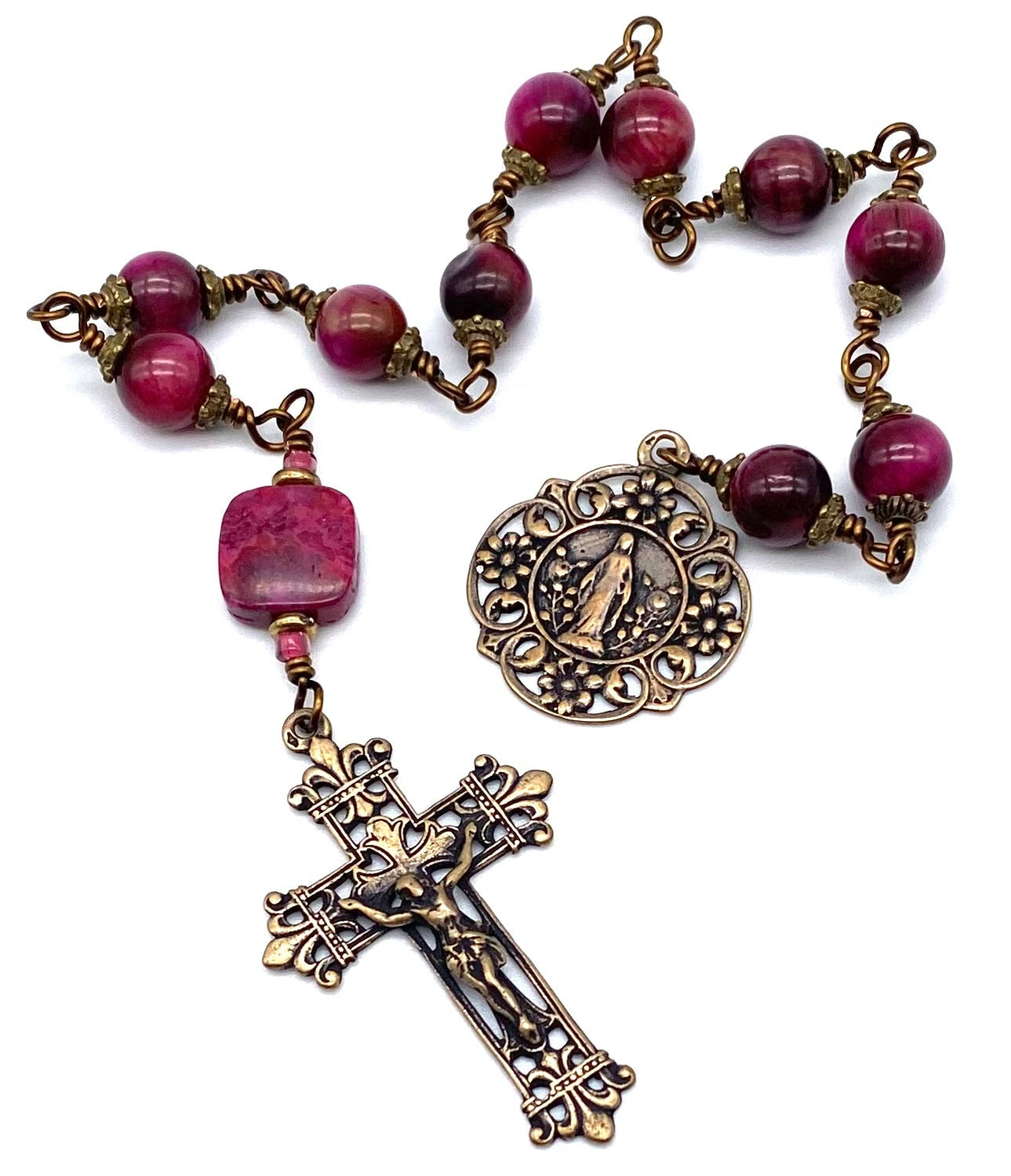 Fuchsia Tiger Eye Gemstone Wire Wrapped Catholic Heirloom Tenner Rosary