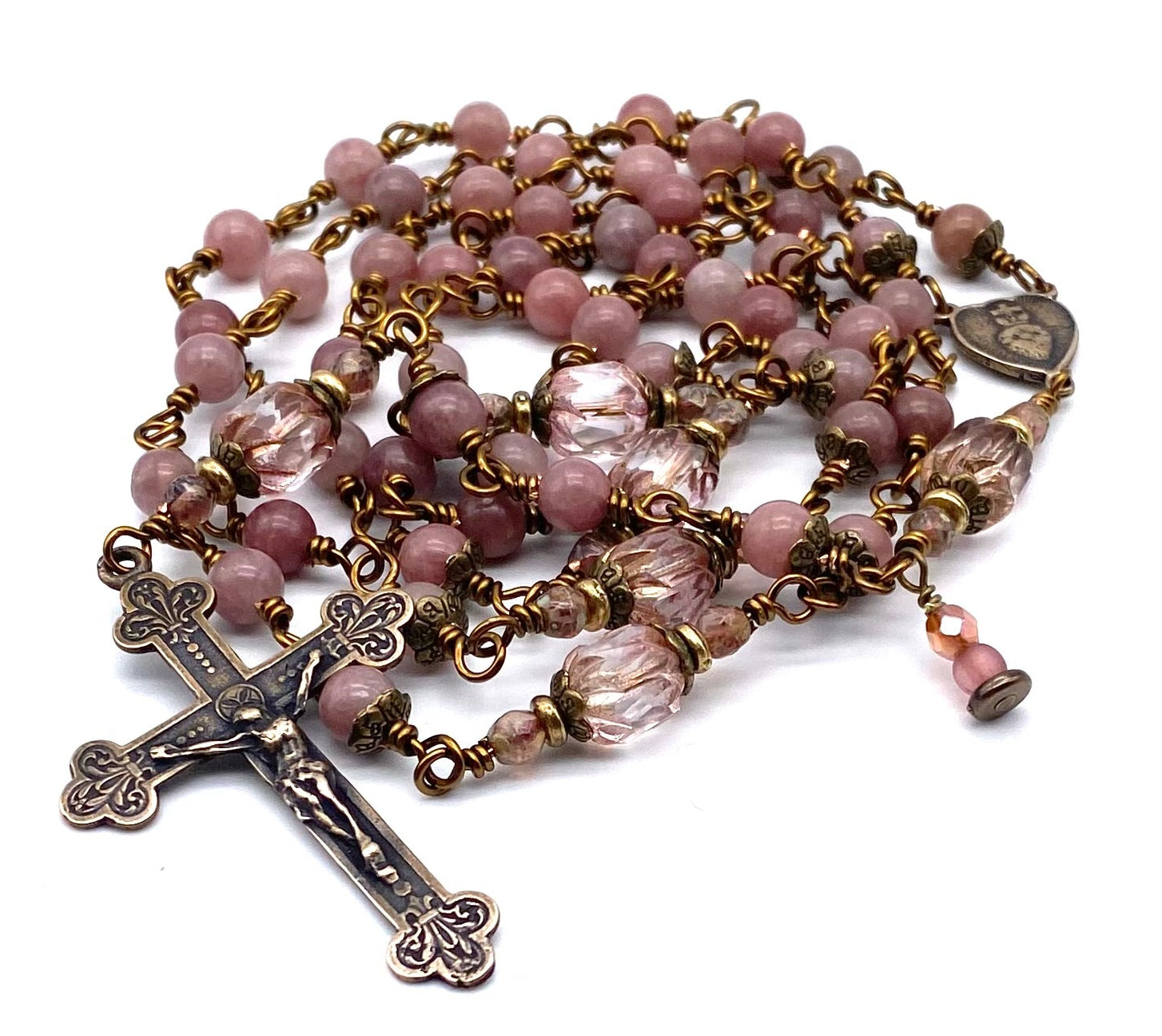 Beautiful, handcrafted vintage-inspired Catholic Heirloom Rosary with Strawberry Quartz gemstones. Pater beads are Antique Pink Czech glass beads with Rose Pink glass accent beads and Antique brass bead caps. Each bead is wire wrapped using sturdy Vintage Bronze colored wire for strength and durability. The intricate design of the crucifix and center are antique-styled bronze replicas giving the Rosary that "Old World" finish.