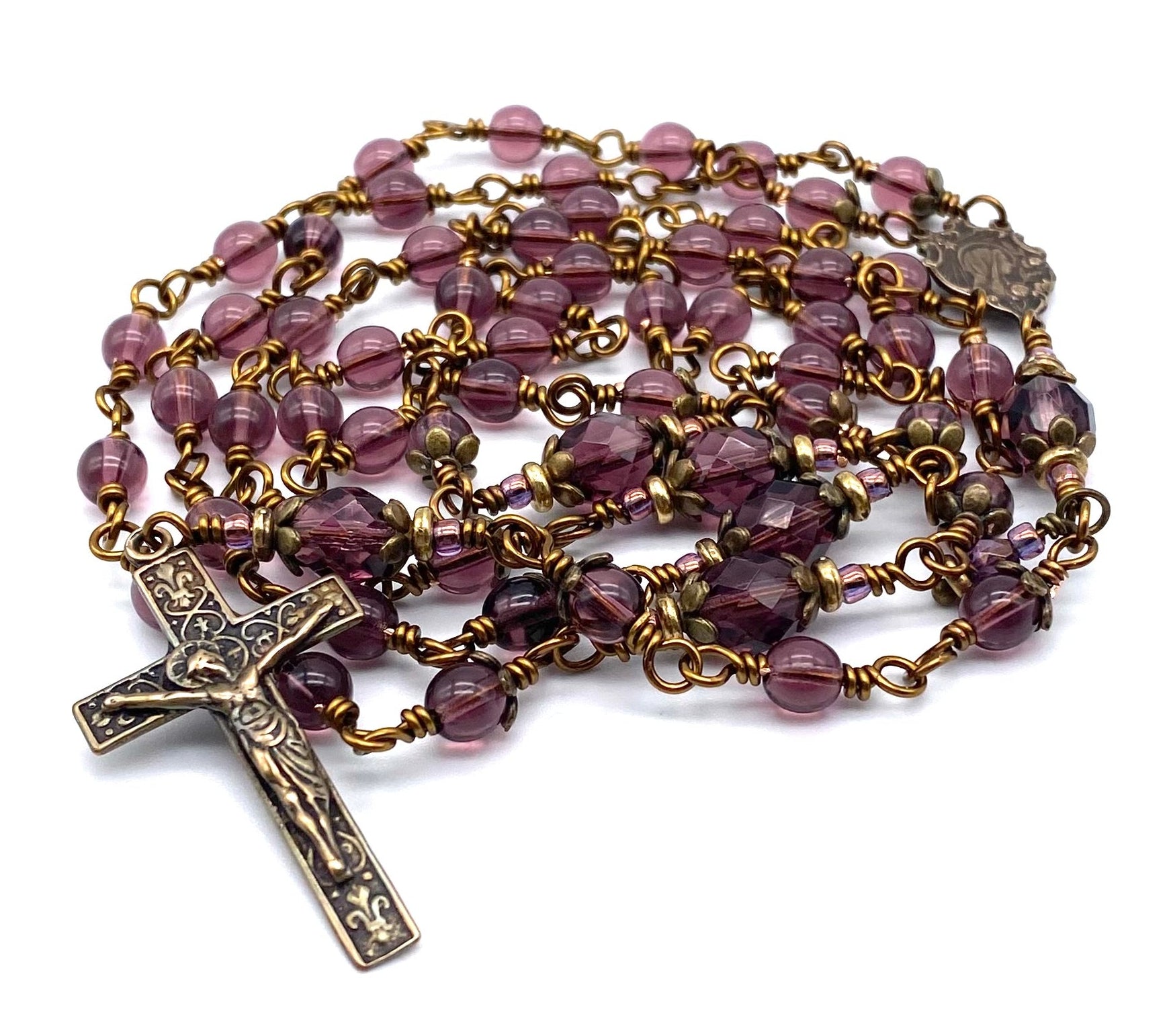 Beautiful handcrafted vintage-inspired Catholic Heirloom Rosary with Dark Amethyst Czech glass beads. Pater beads are Purple Quartz gemstones with Amethyst Czech glass accent beads and Antique Brass bead caps. Each bead is wire wrapped with 20-gauge Vintage Bronze colored wire for strength and durability. The intricate design of the crucifix and center are antique-styled bronze replicas giving the Rosary that "Old World" finish.