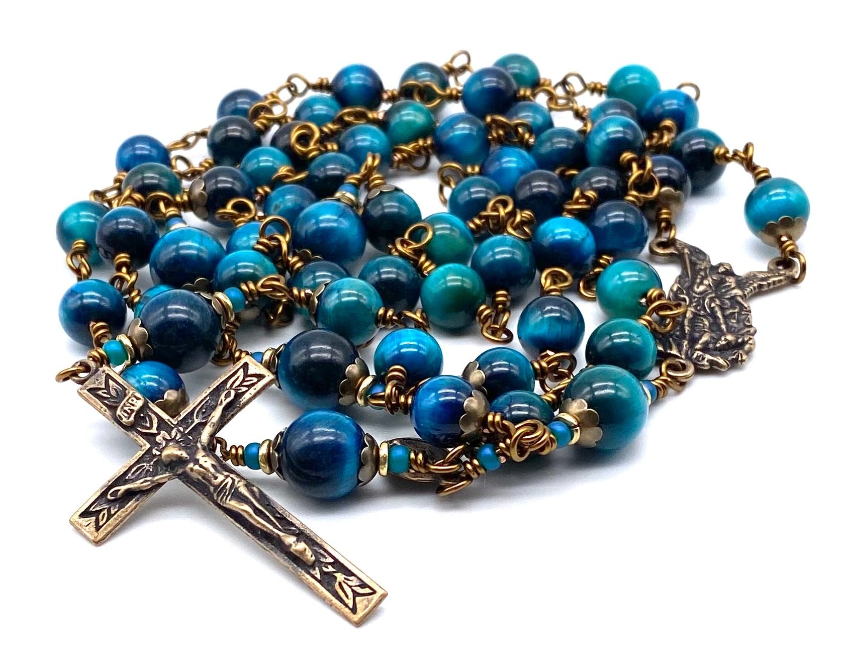 Beautiful, handcrafted vintage-inspired Catholic Heirloom Rosary with Azure Blue Tiger Eye gemstones. Pater beads are Larger Azure Blue Tiger Eye beads with glass accent beads and Antique Brass bead caps. Each bead is wire wrapped using sturdy Vintage Bronze colored wire for strength and durability. The intricate design of the crucifix and center are antique-styled solid bronze replicas giving the Rosary that “Old World” finish.