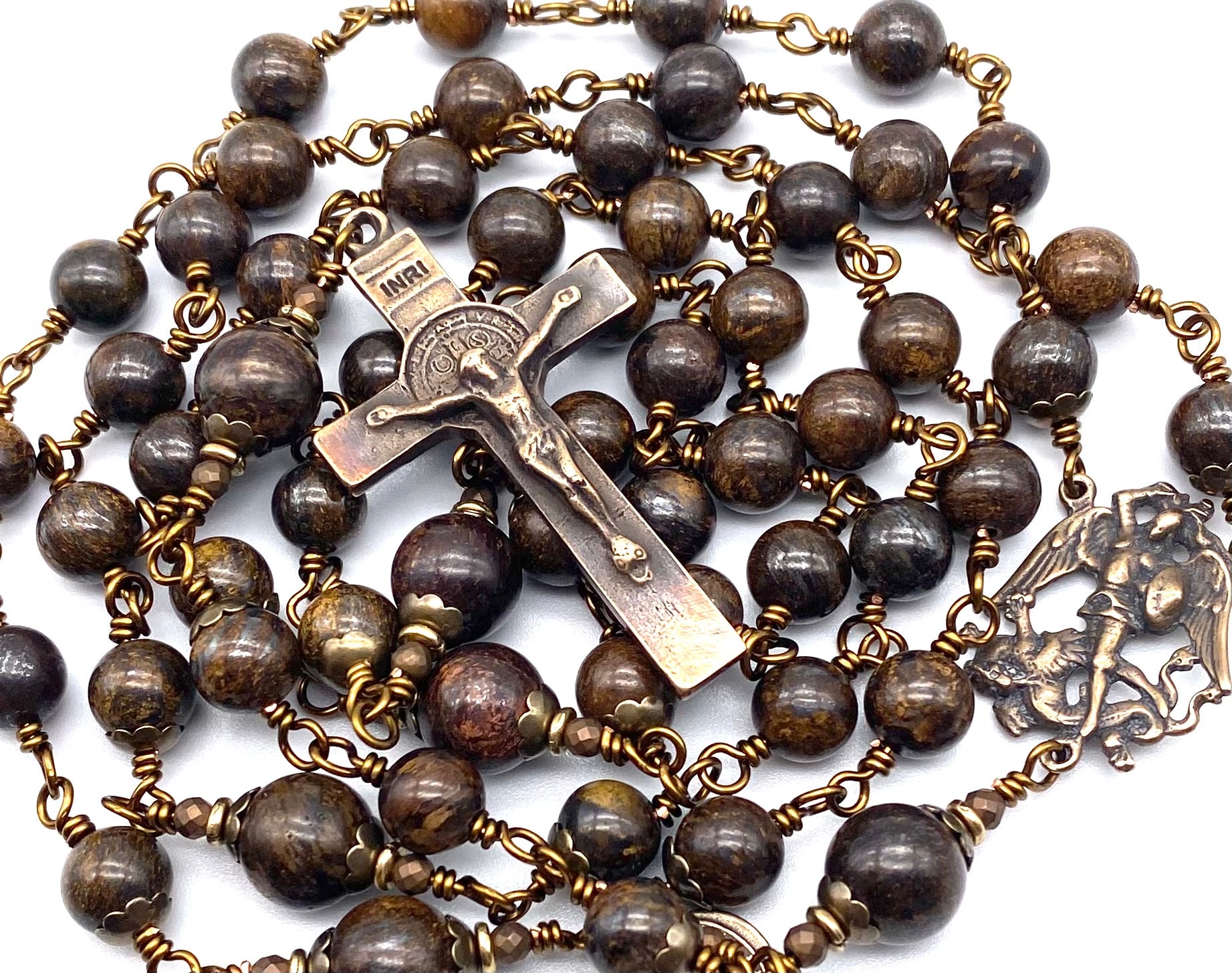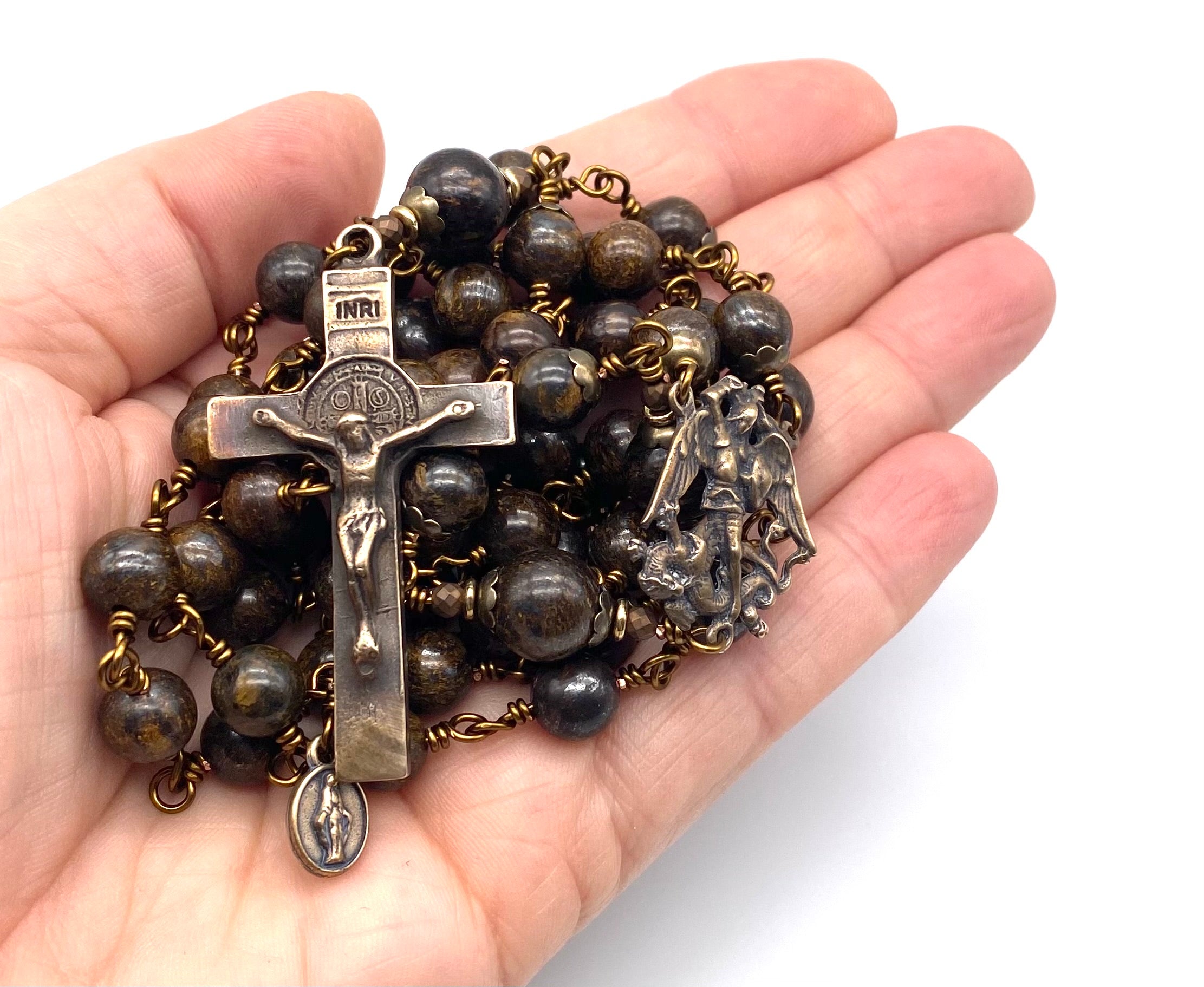 Beautiful handcrafted vintage-inspired Catholic Heirloom Rosary with Bronzite gemstones. Pater beads are larger Bronzite gemstones with Bronzed Czech glass accent beads and Antique Brass bead caps. Each bead is wire wrapped using sturdy Vintage Bronze colored wire for strength and durability. The intricate design of the crucifix and center are antique-styled bronze replicas giving the Rosary that "Old World" finish.
