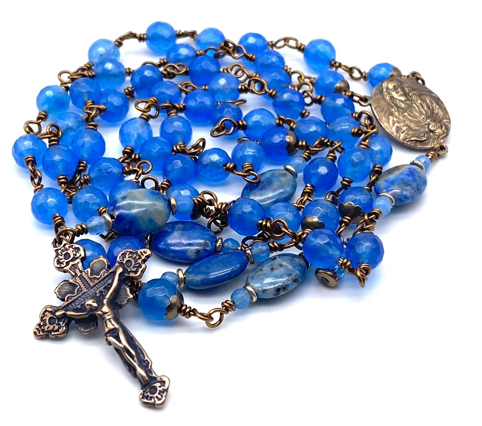 Beautiful, handcrafted vintage-inspired Catholic Heirloom Rosary with Cobalt Blue Jade Gemstones. Pater beads are Lapis oval gemstone beads with Czech glass accent beads and Antique brass bead caps. Each bead is wire wrapped using sturdy Vintage Bronze colored wire for strength and durability. The intricate design of the crucifix and center are antique-styled bronze replicas giving the Rosary that “Old World” finish.