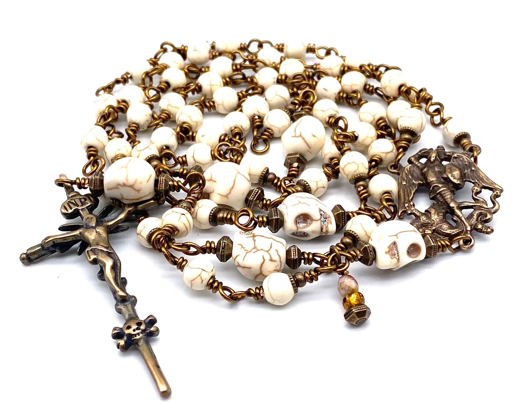 Beautiful handcrafted vintage-inspired Catholic Heirloom "Memento Mori" Rosary with Magnesite Matte gemstones. Pater beads are Magnesite Skull beads with Antique Brass bead caps. Each bead is wire wrapped using sturdy Vintage Bronze colored wire for strength and durability. The intricate design of the crucifix and center are antique-styled bronze replicas giving the Rosary that "Old World" finish.