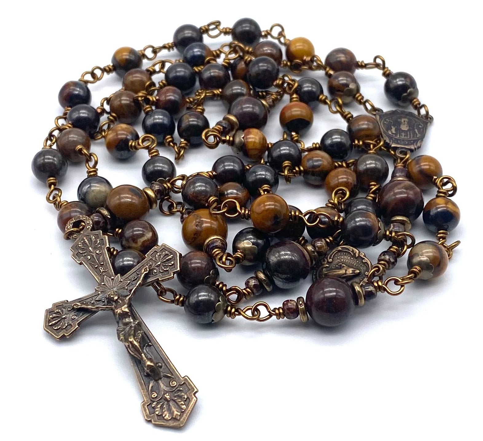 Beautiful, handcrafted vintage-inspired Catholic Heirloom Rosary with Red Brown Tiger Iron gemstones. Pater beads are larger Tiger Iron beads with Czech glass accent beads and Antique Brass bead caps. Each bead is wire wrapped using sturdy Vintage Bronze colored wire for strength and durability. The intricate design of the crucifix and center are antique-styled solid bronze replicas giving the Rosary that “Old World” finish.