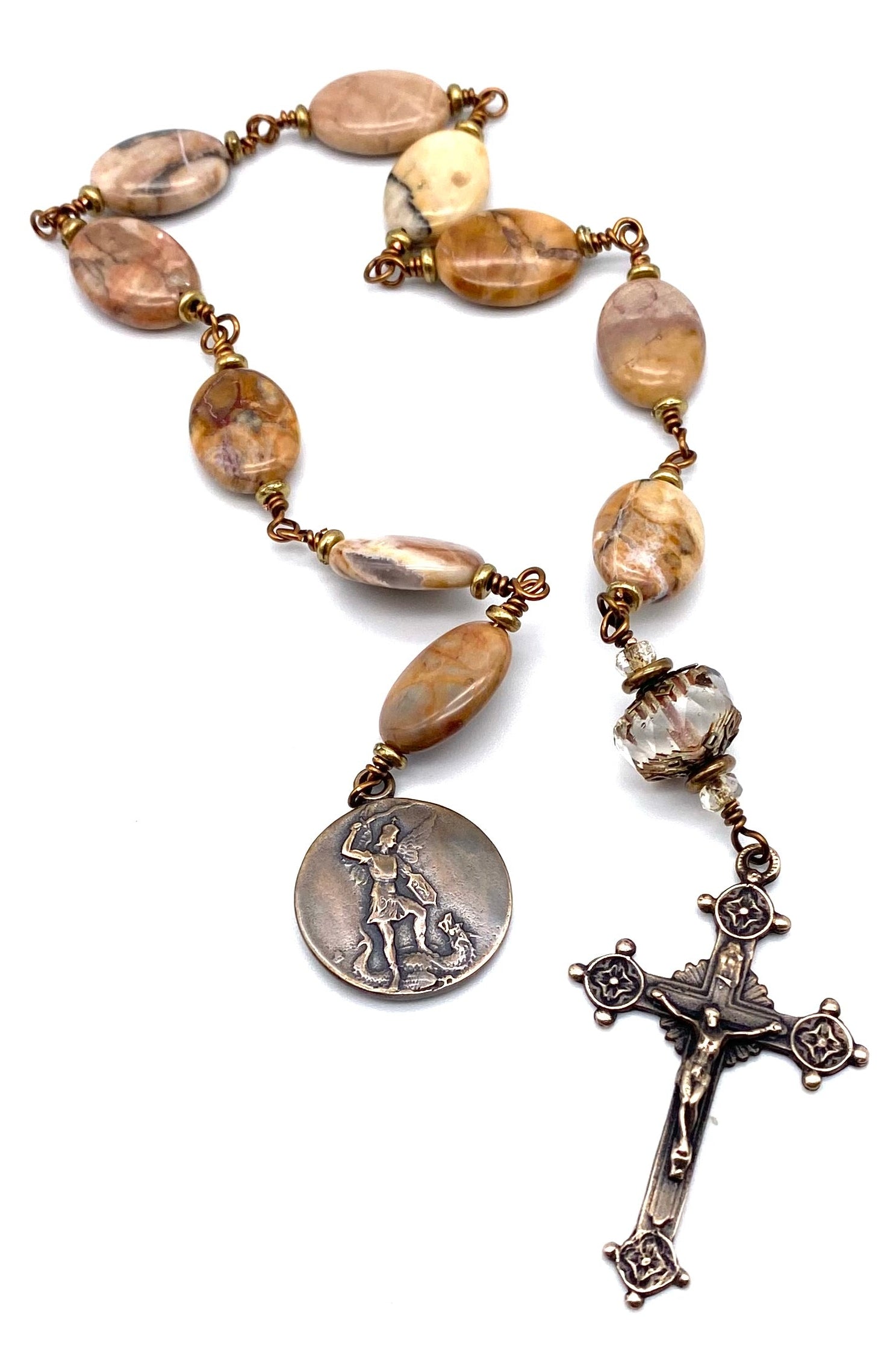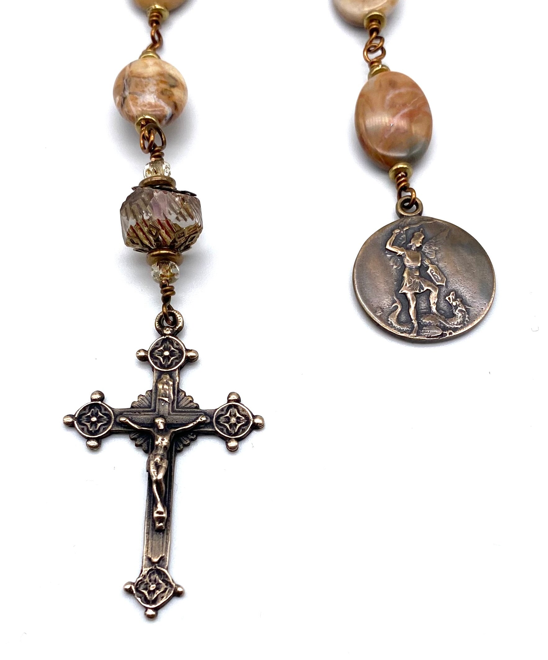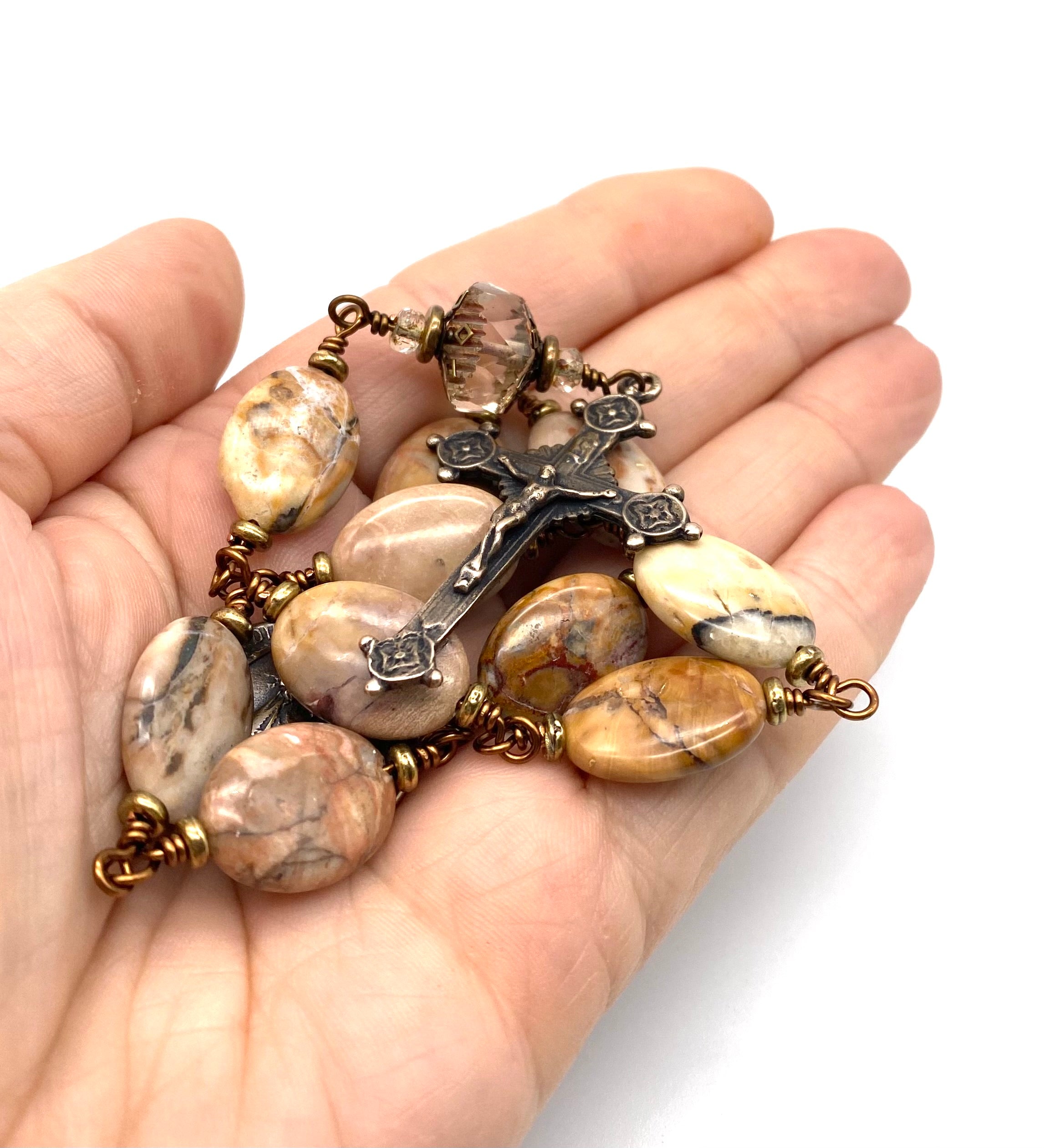 Beautiful handcrafted vintage-inspired Catholic Heirloom Tenner Rosary with Venus Jasper Oval gemstones. Pater bead is a Transparent Crystal Picasso Czech glass with Czech glass accent bead and Antique Brass bead caps. Each bead is wire wrapped using sturdy Vintage Bronze colored wire for strength and durability. The intricate design of the crucifix and medal are solid bronze replicas giving the Tenner that "Old World" finish.