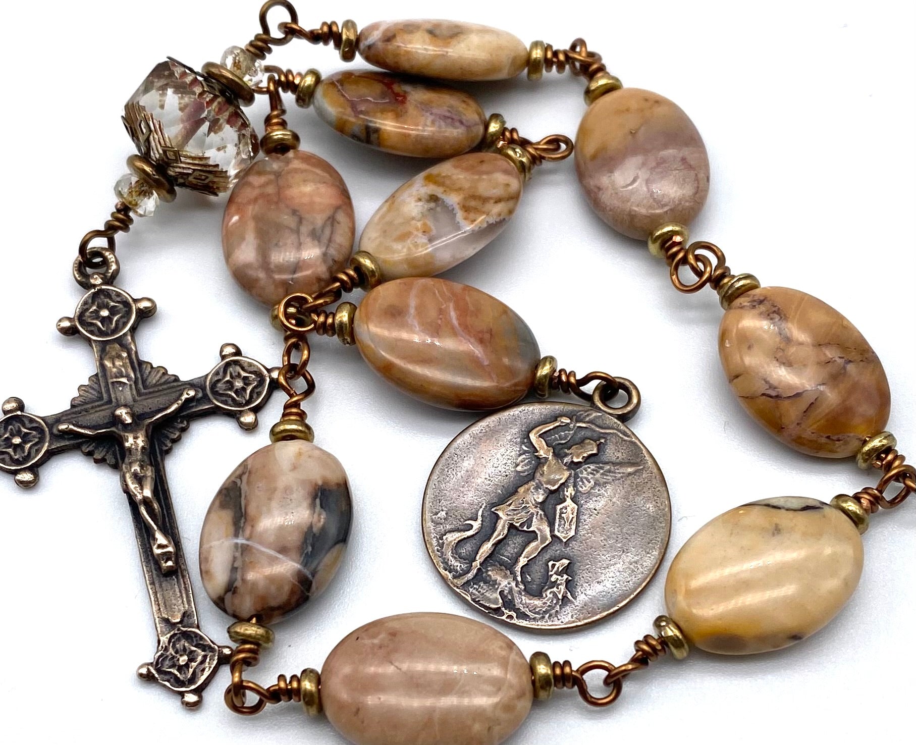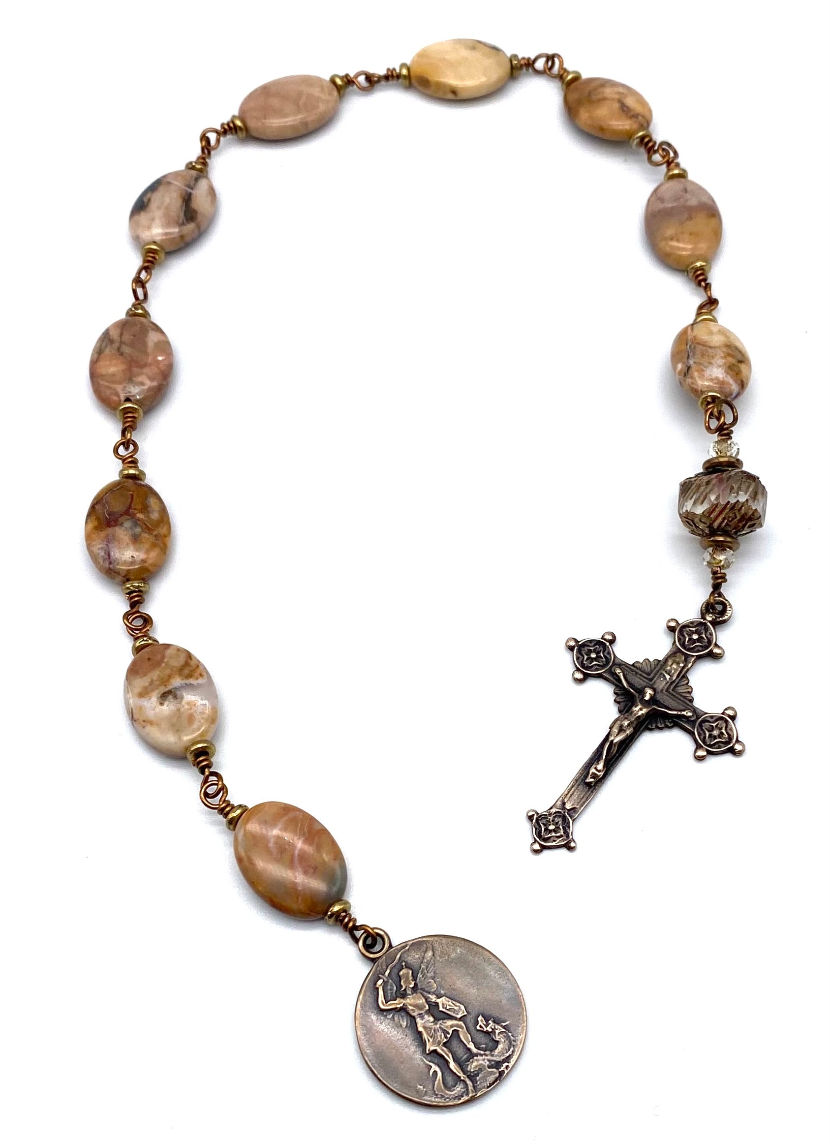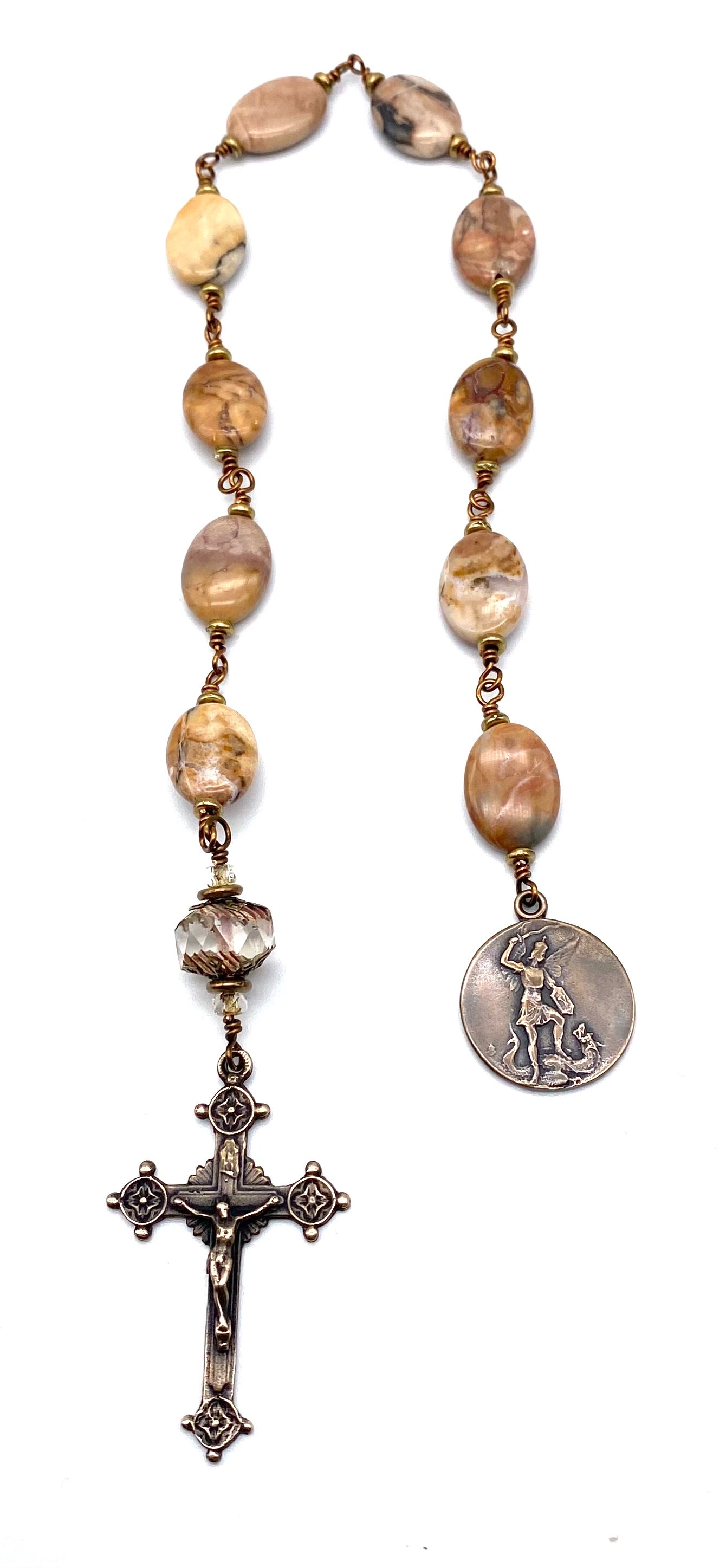 Beautiful handcrafted vintage-inspired Catholic Heirloom Tenner Rosary with Venus Jasper Oval gemstones. Pater bead is a Transparent Crystal Picasso Czech glass with Czech glass accent bead and Antique Brass bead caps. Each bead is wire wrapped using sturdy Vintage Bronze colored wire for strength and durability. The intricate design of the crucifix and medal are solid bronze replicas giving the Tenner that "Old World" finish.