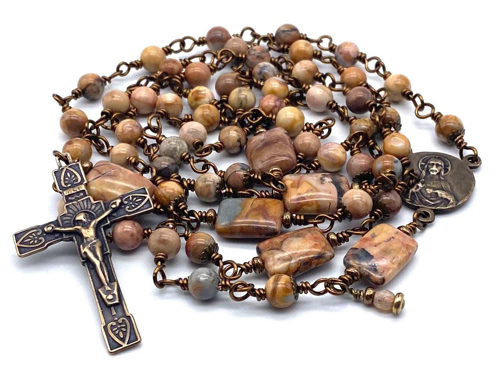 Beautiful, handcrafted vintage-inspired Catholic Heirloom Rosary with Venus Jasper Gemstones. Pater beads are larger Venus Jasper beads with glass accent beads and Antique Brass bead caps. Each bead is wire wrapped using sturdy Vintage Bronze colored wire for strength and durability. The intricate design of the crucifix and center are antique-styled solid bronze replicas giving the Rosary that “Old World” finish.